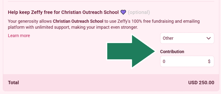 This platform (Zeffy) does not charge the school to process credit cards, but they do include an automatic tip (which does NOT go to the School). If you do not wish to tip Zeffy, in the second step below, select “Other” and enter $0.